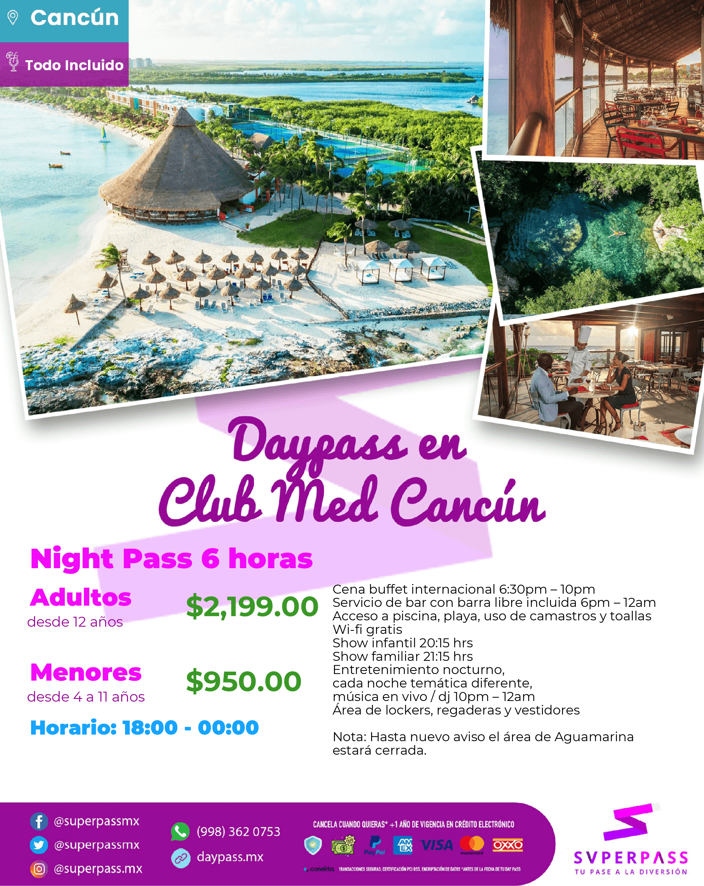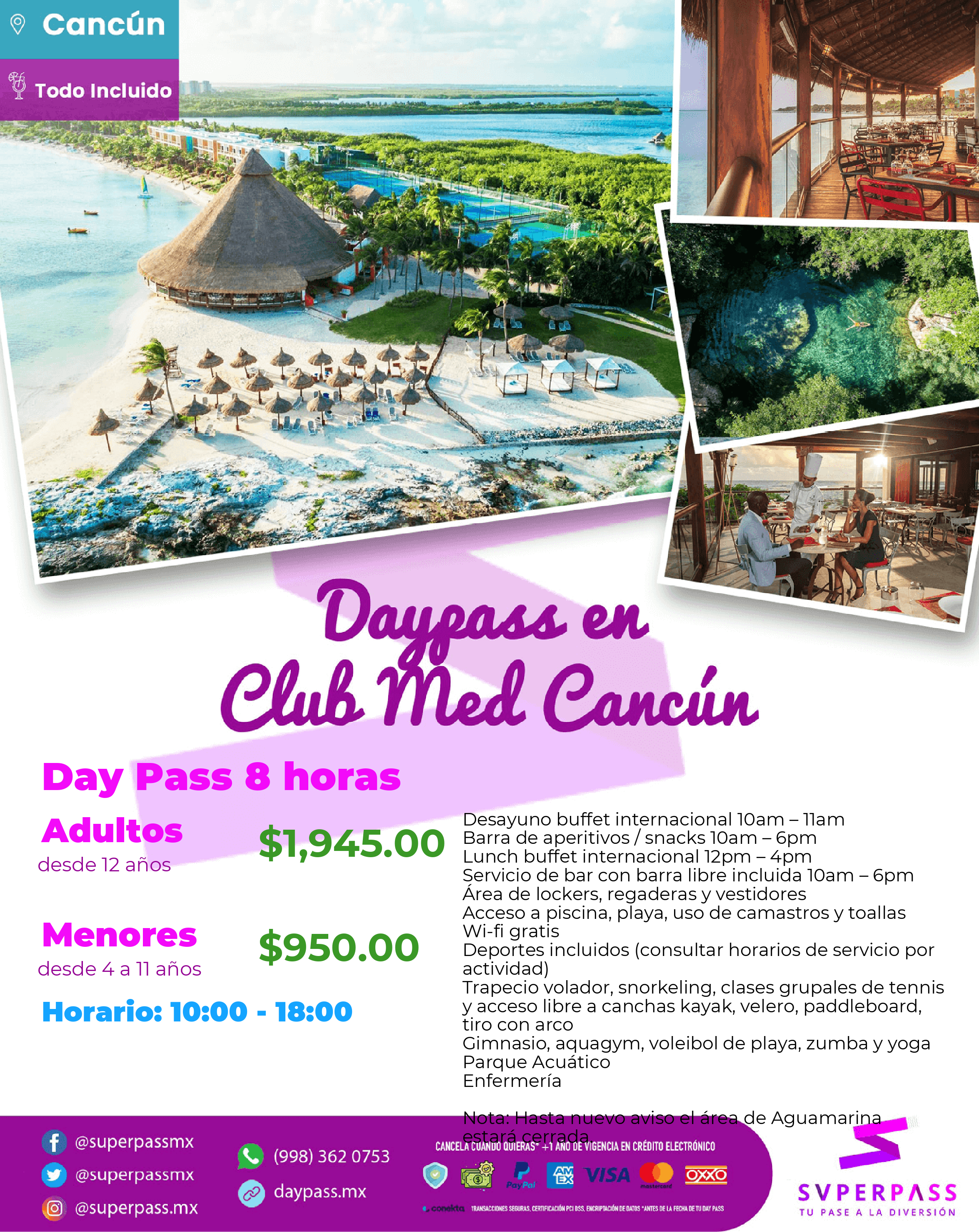 Goza de un daypass en Club Med Cancún el cual es un hotel familiar sofisticado, junto en una de las más hermosas zonas de Cancún, donde es privilegiado por estar rodeado por tres playas de arena blanca junto al segundo arrecife de coral más grande del mundo por lo que te ofrece una amplia variedad de deportes acuáticos incluidos en tu daypass, por ejemplo: esquí acuático, kayak, velero, snorkeling entre otros. También en su daypass en Club Med Cancún la experiencia en sus restaurantes es extraordinaria, los mejores chefs se dan cita para satisfacer los paladares más exigentes, sin lugar a duda este daypass lo disfrutará al máximo.