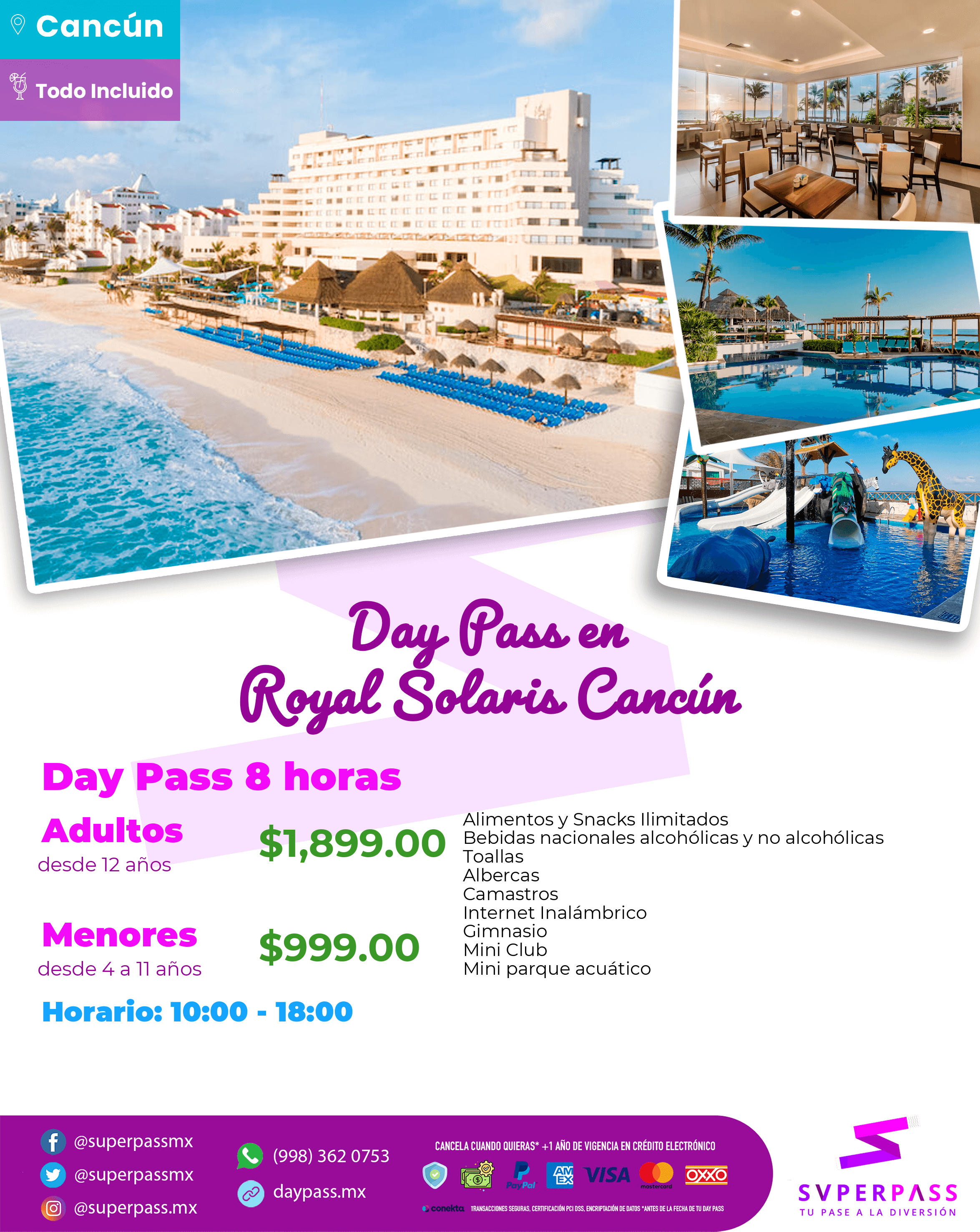 Adultos (Desde 12años )Precio : $1,899.00 MXNMenores con costo (Desde 4años / hasta 11 años )Precio : $999.00 MXNMenores sin costo (Desde 0años / hasta 3 años )Precio : SIN COSTO