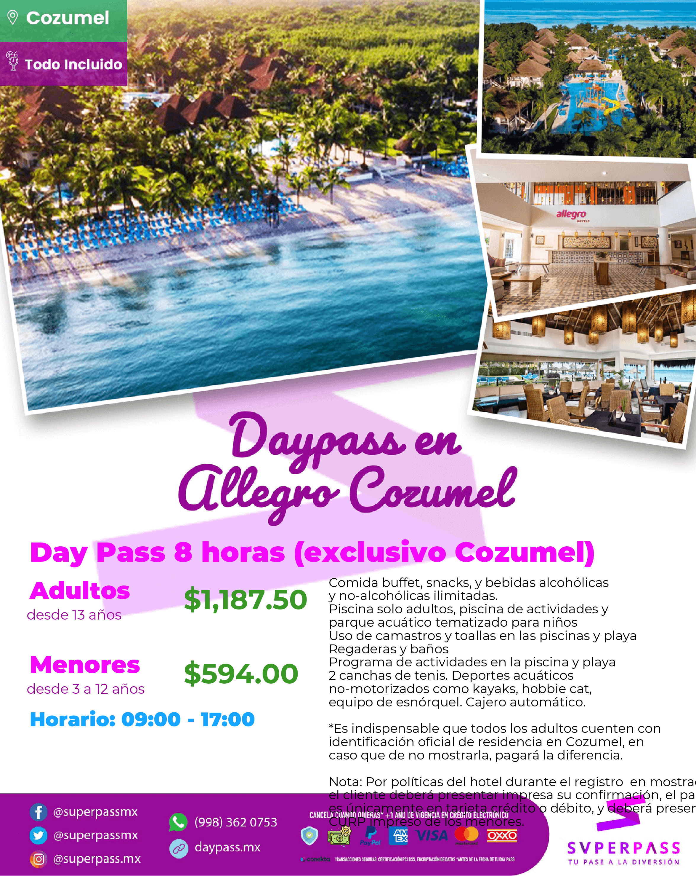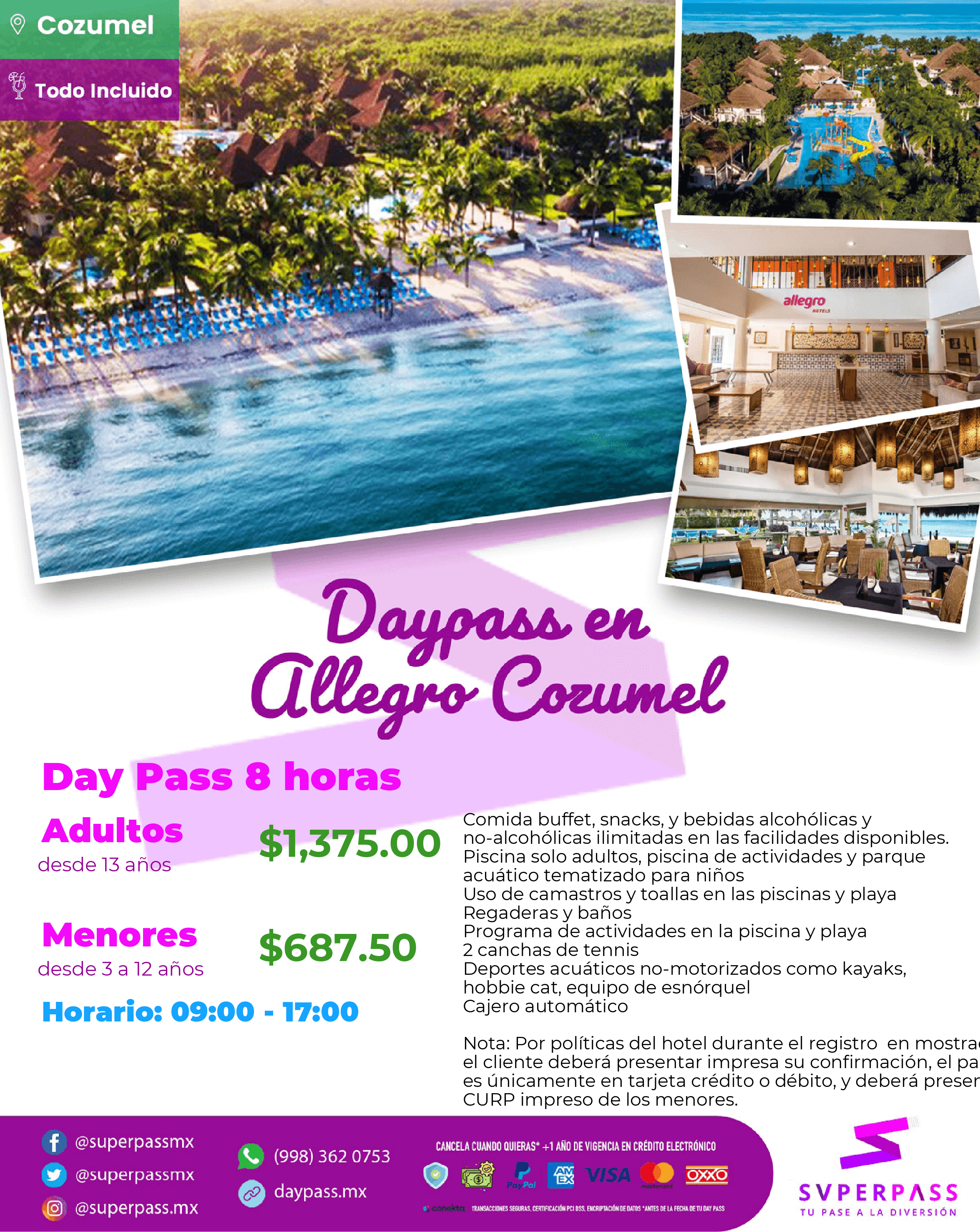 - El daypass NO incluye : Paquetes de boda Servicios de Spa (masajes, tratamientos y salón de belleza) Tours de esnórquel, buceo, etc.