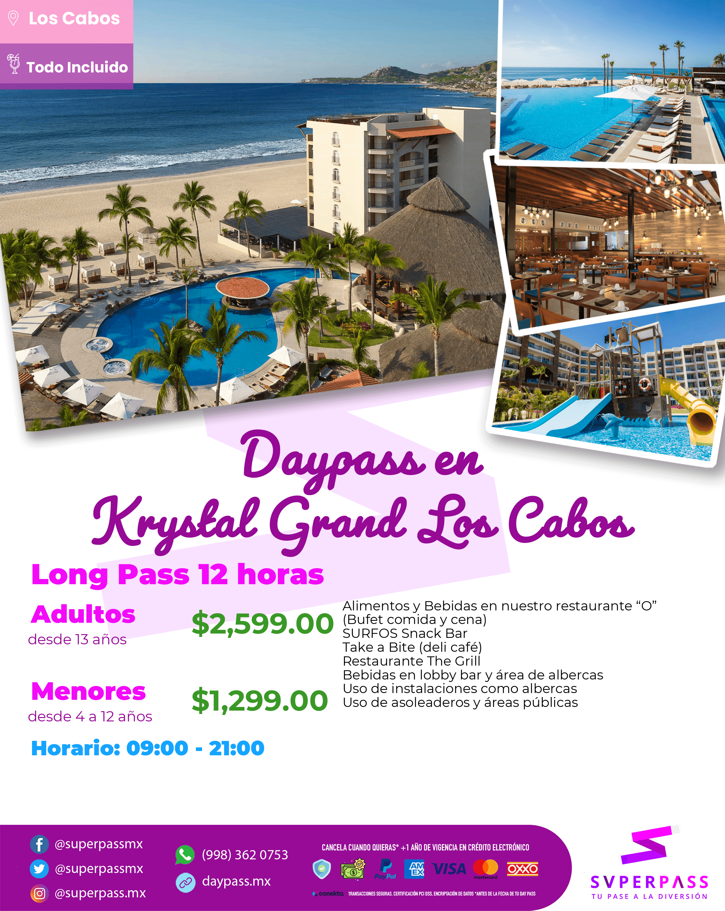 Adultos (Desde 13años )Precio : $2,599.00 MXNMenores con costo (Desde 4años / hasta 12 años )Precio : $1,299.00 MXNMenores sin costo (Desde 0años / hasta 3 años )Precio : SIN COSTO
