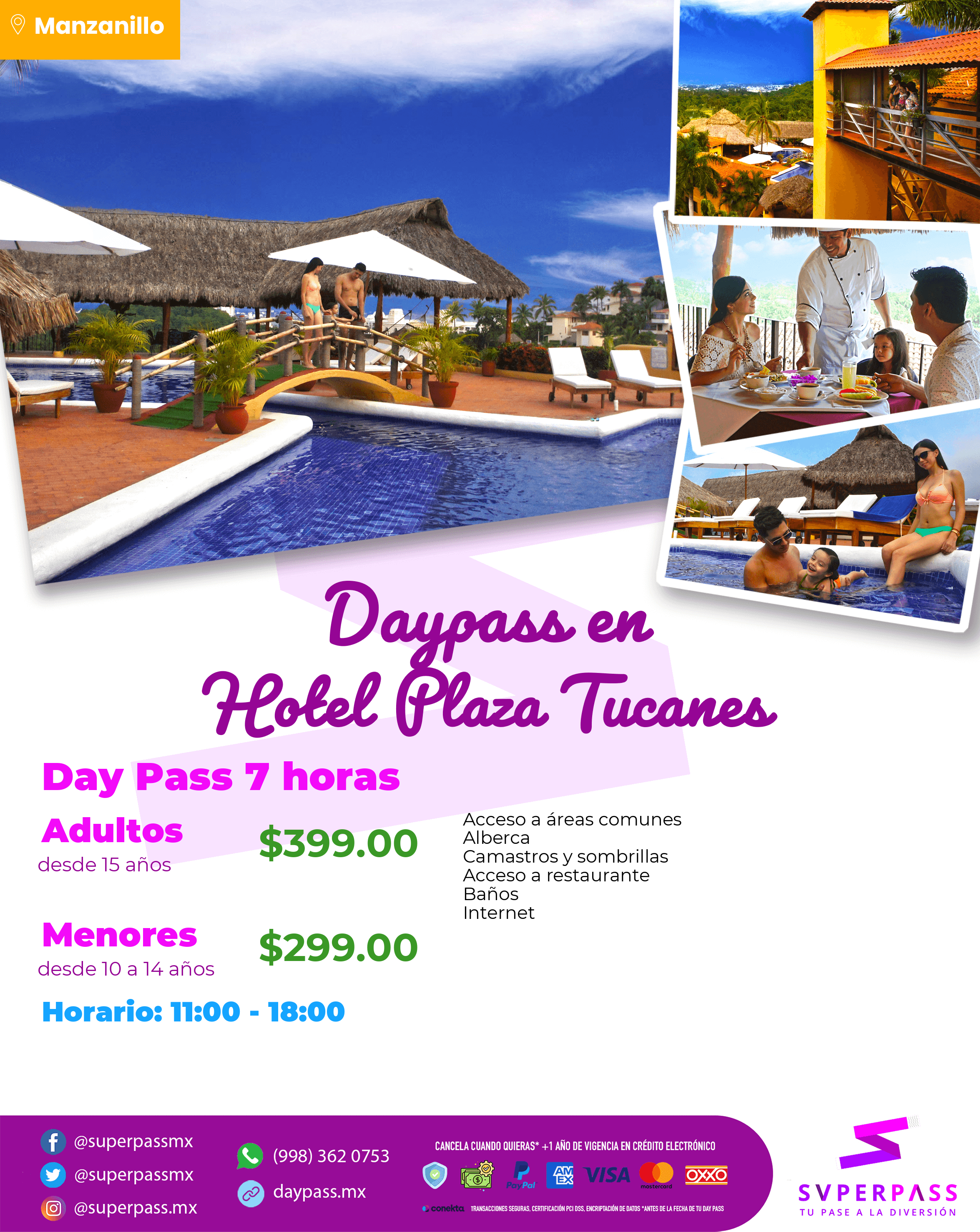 - El daypass NO incluye : Alimentos y bebidas, toallas, habitación