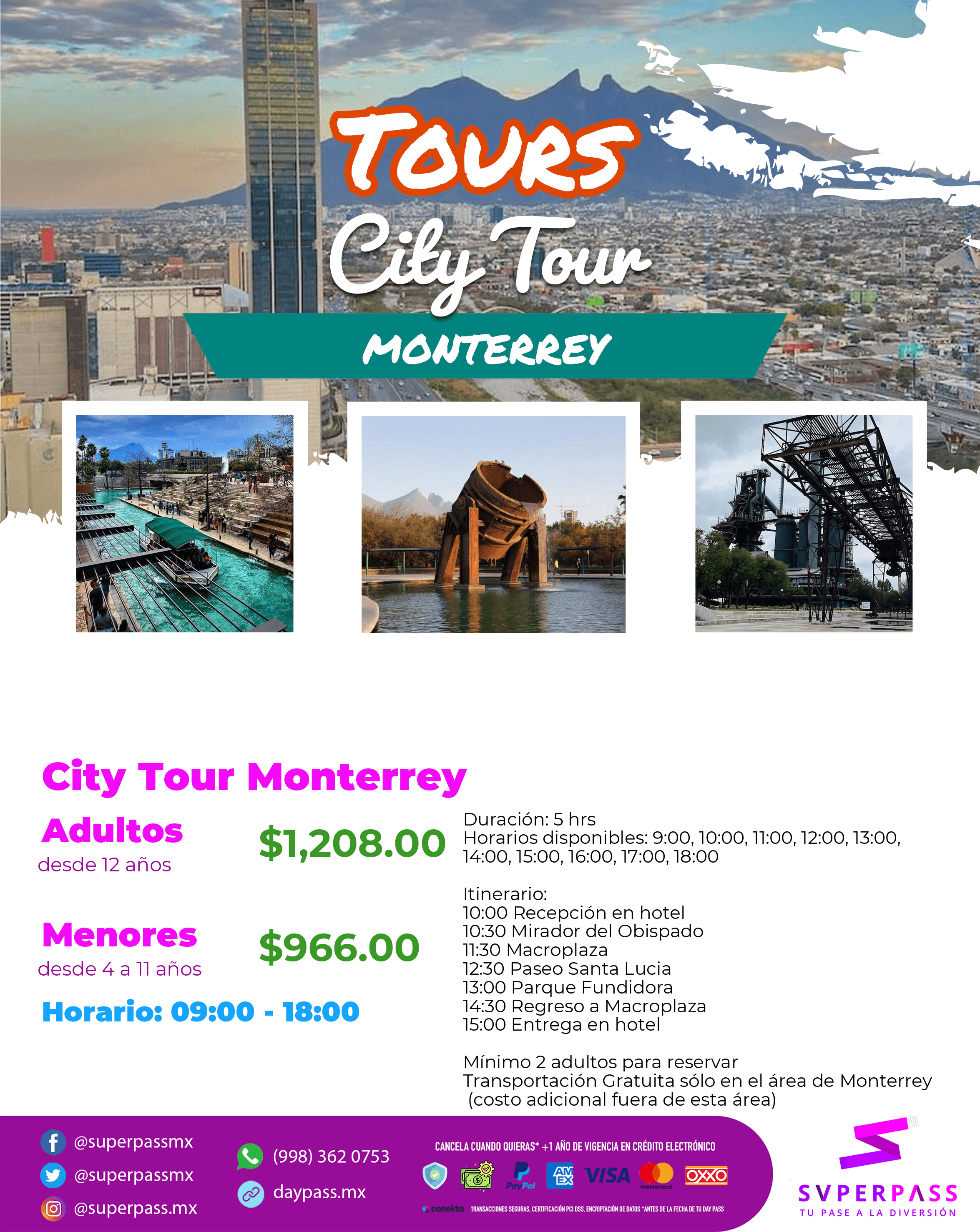 Adultos (Desde 12años )Precio : $1,208.00 MXNMenores con costo (Desde 4años / hasta 11 años )Precio : $966.00 MXNMenores sin costo (Desde 0años / hasta 3 años )Precio : SIN COSTO