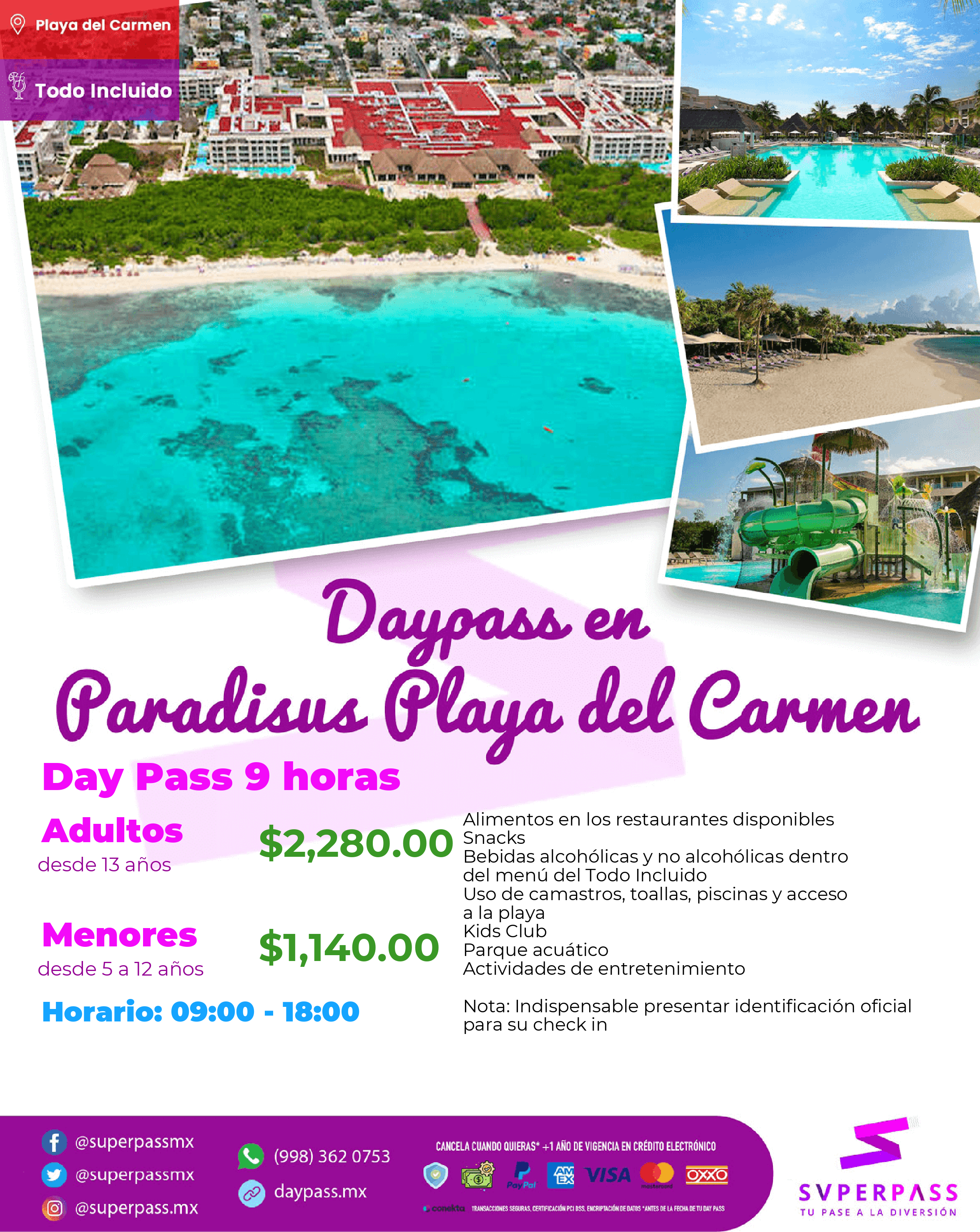 Nota: Para adultos es requisito indispensable para ingresar al hotel que presentar INE o Pasaporte en físico y para menores CURP, acta de nacimiento o pasaporte.