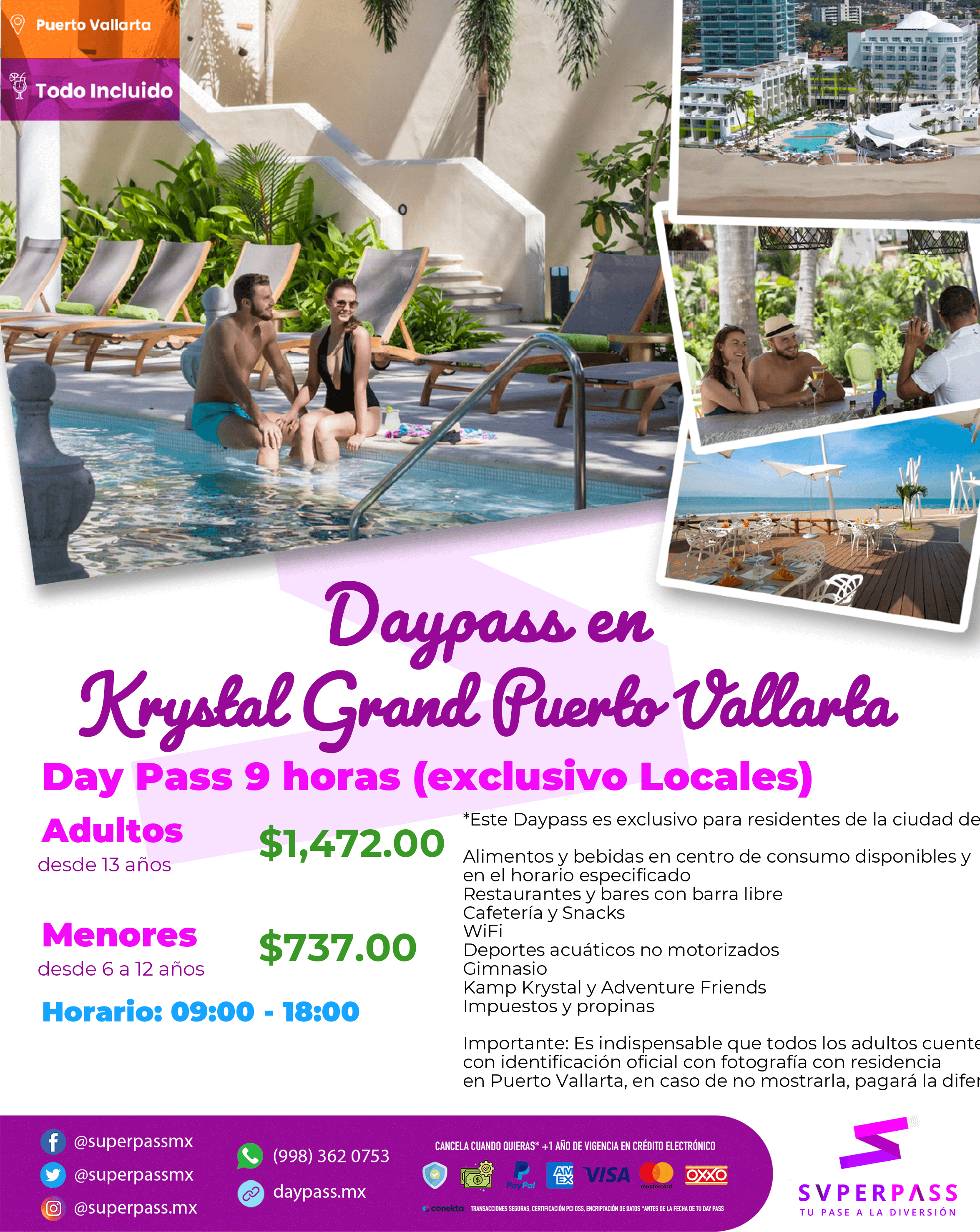 Adultos (Desde 13años )Precio : $1,899.00 MXNMenores con costo (Desde 6años / hasta 12 años )Precio : $949.00 MXNMenores sin costo (Desde 0años / hasta 5 años )Precio : SIN COSTO