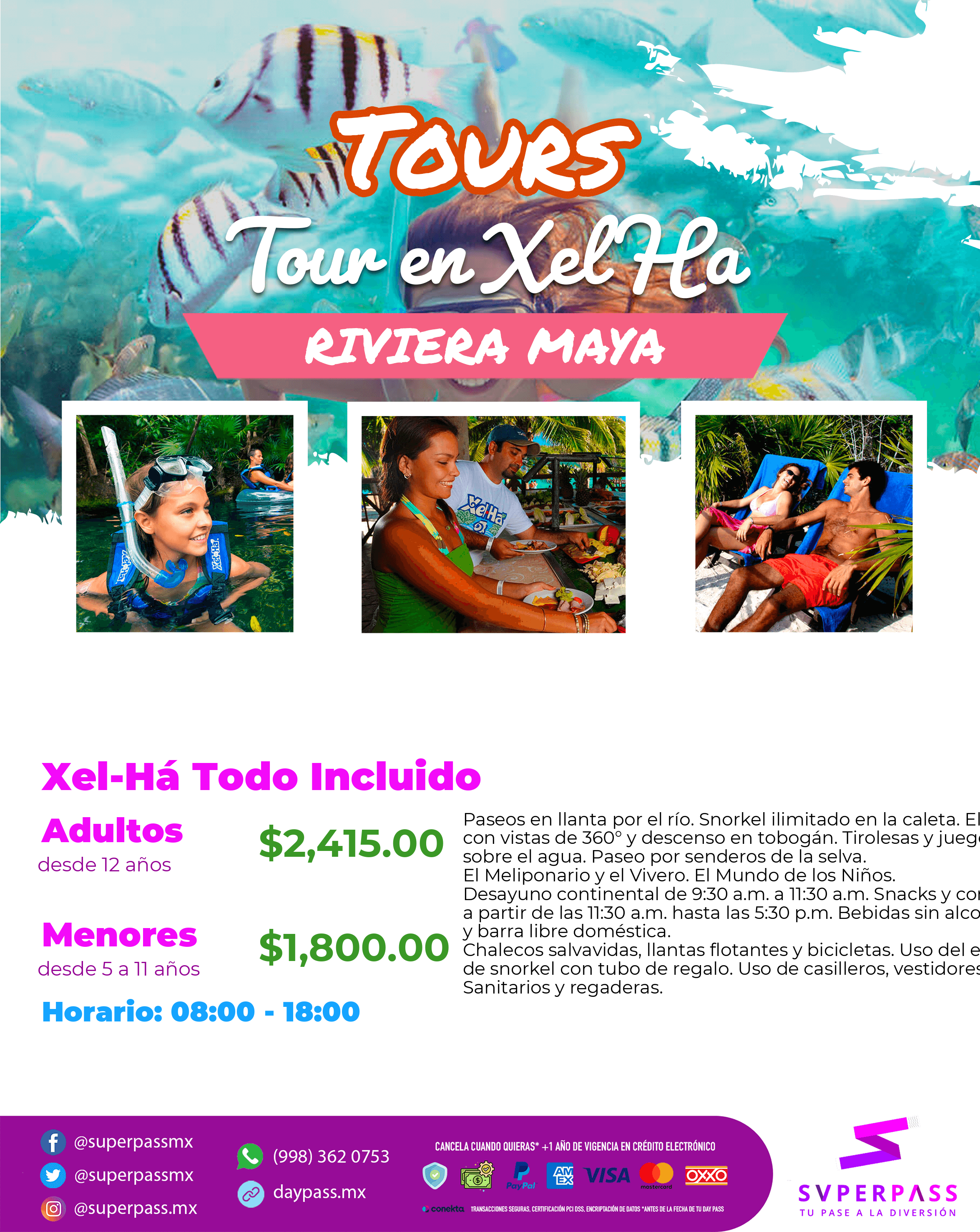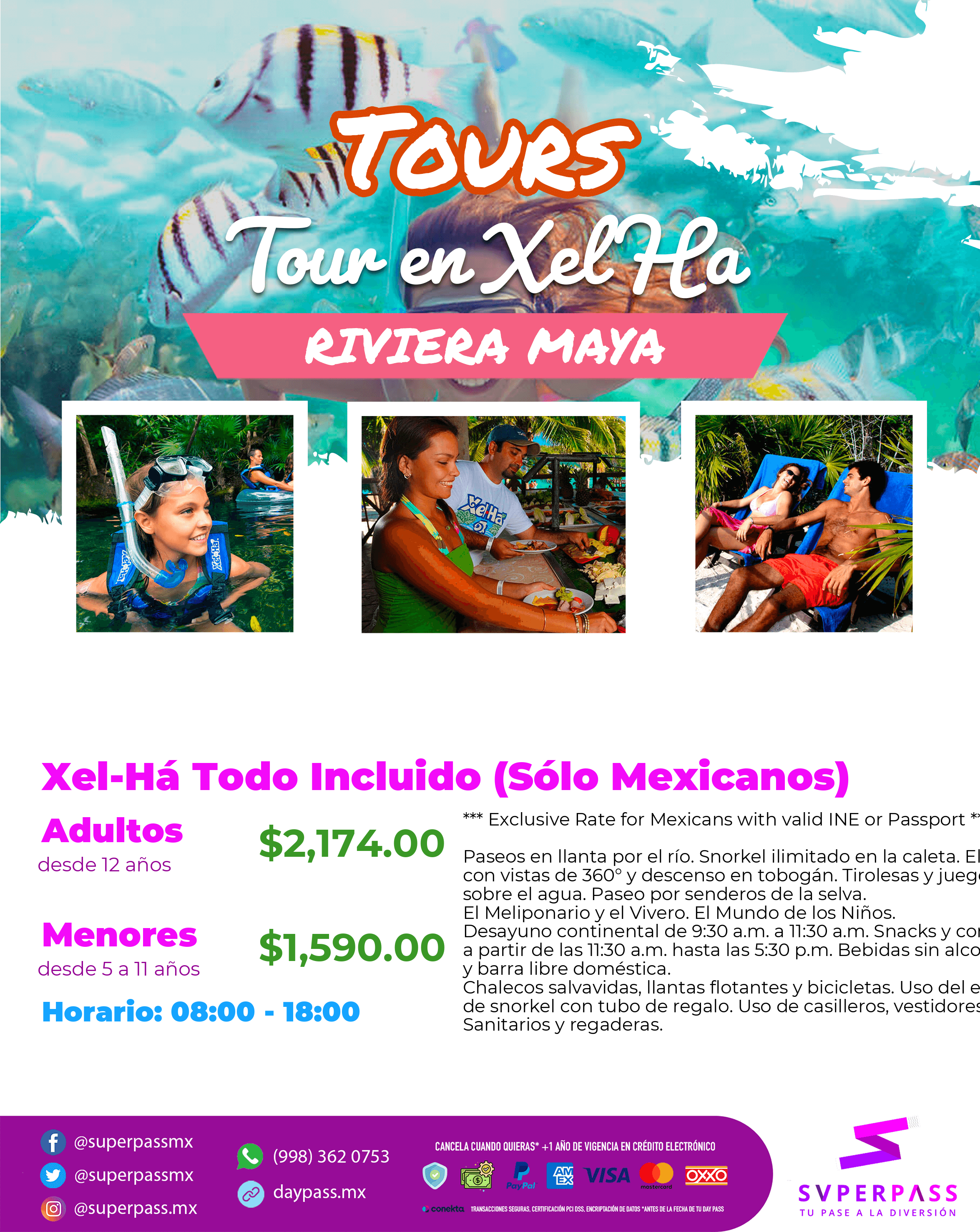 - El daypass NO incluye : No incluye Transportacion No incluye Guias No incluye actividades adicionales como nado con delfines, buceo etc. Informacion Importante Niños menores de 4 años entran gratis. De 5 a 11 años pagan la mitad del boleto de adulto (en ambos casos es indispensable presentar identificación en las taquillas de los Parques). Niños mayores a 1.40 m pero menores de 12 años, también deberán presentar identificación para comprobar su edad. Las reservaciones canceladas con más de dos días de antelación a la fecha de llegada, están sujetas a un cargo del 10% por gastos administrativos. De 2 a 0 días antes de la fecha de llegada, o en caso de no llegar, no serán reembolsables. No es posible hacer cambio de fecha el mismo día de tu visita.