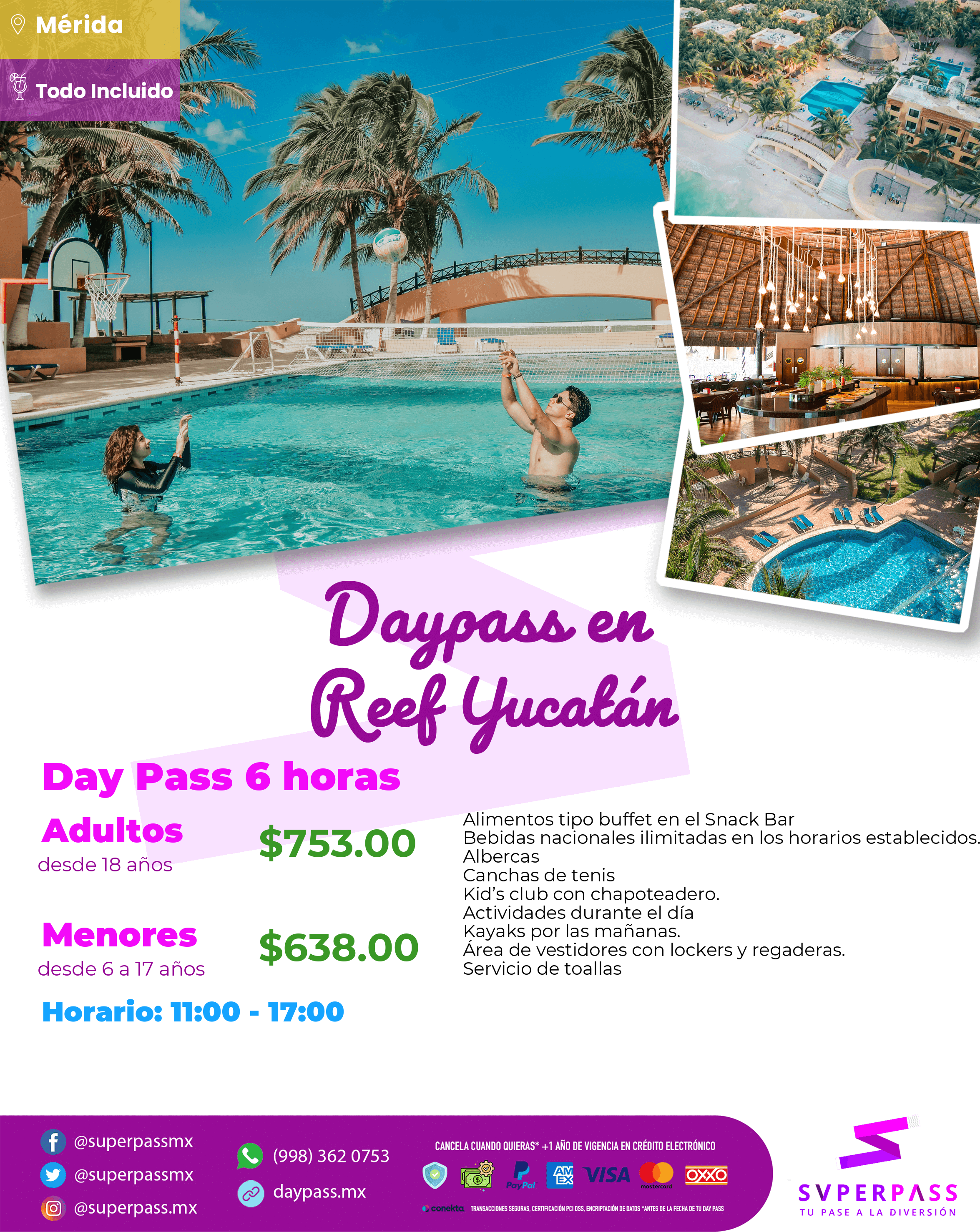 - El daypass NO incluye : Habitación, el daypass no es Pet Friendly, Acceso al restaurante principal (ese es un servicio con costo adicional)