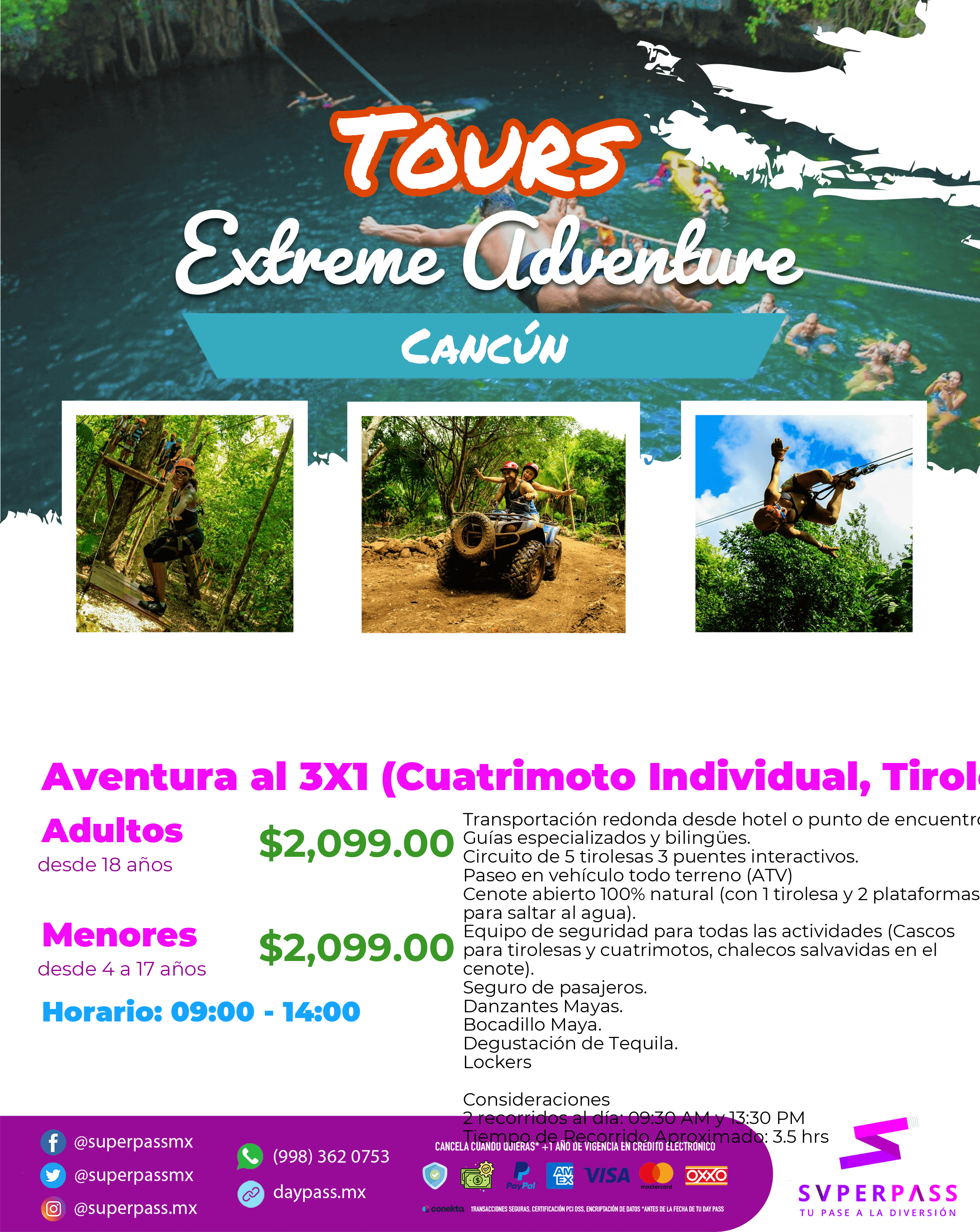 Adult (From 18years old )Price : $2,099.00 MXNChild (From 4years old / from 17 years old )Price : $2,099.00 MXNInfant (From 0years old / from 3 years old )Price : FREE