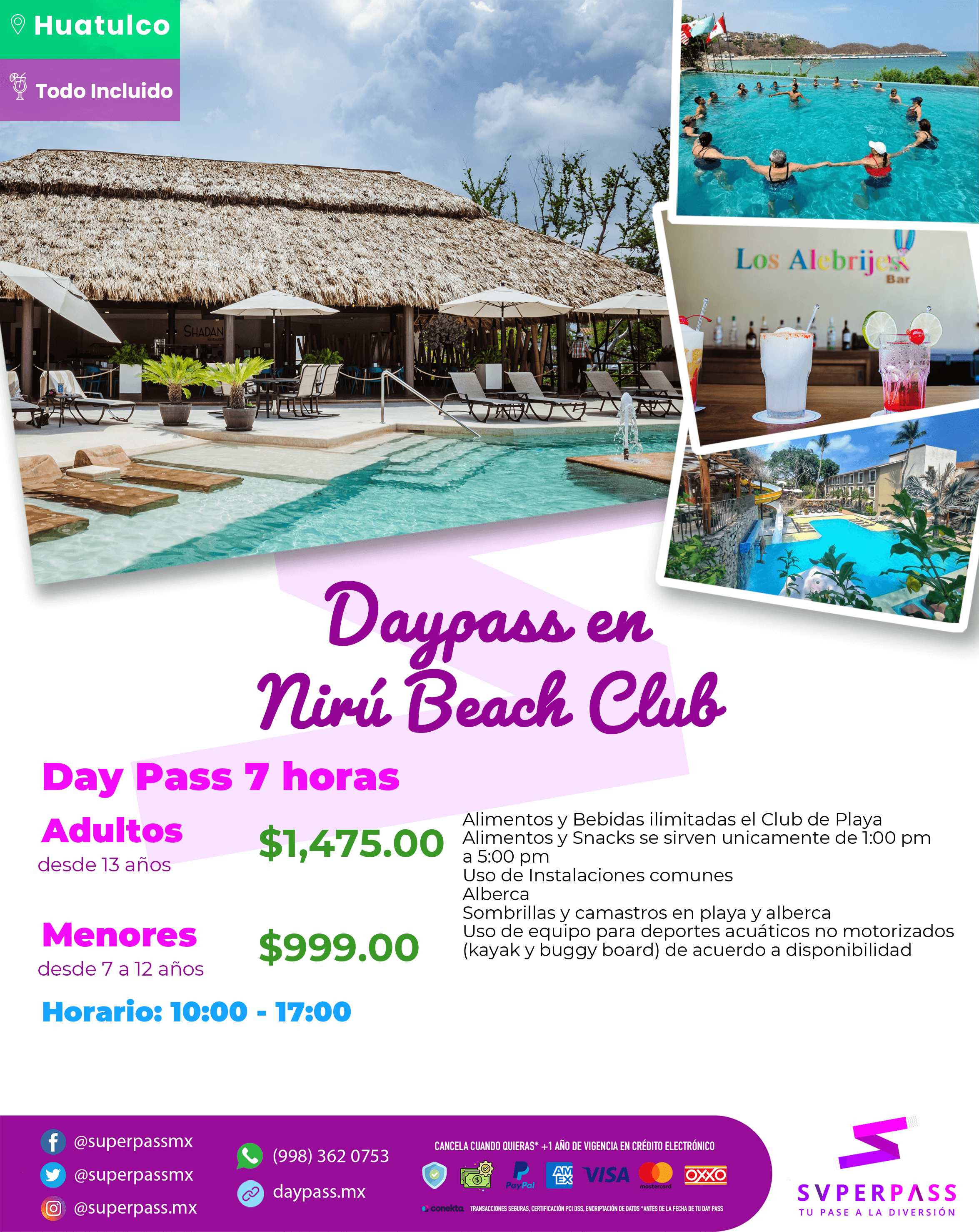 - The Daypass does NOT include : Lodging, breakfast, access to the cabin area, spa service, temazcal, The entry of food and drinks is prohibited