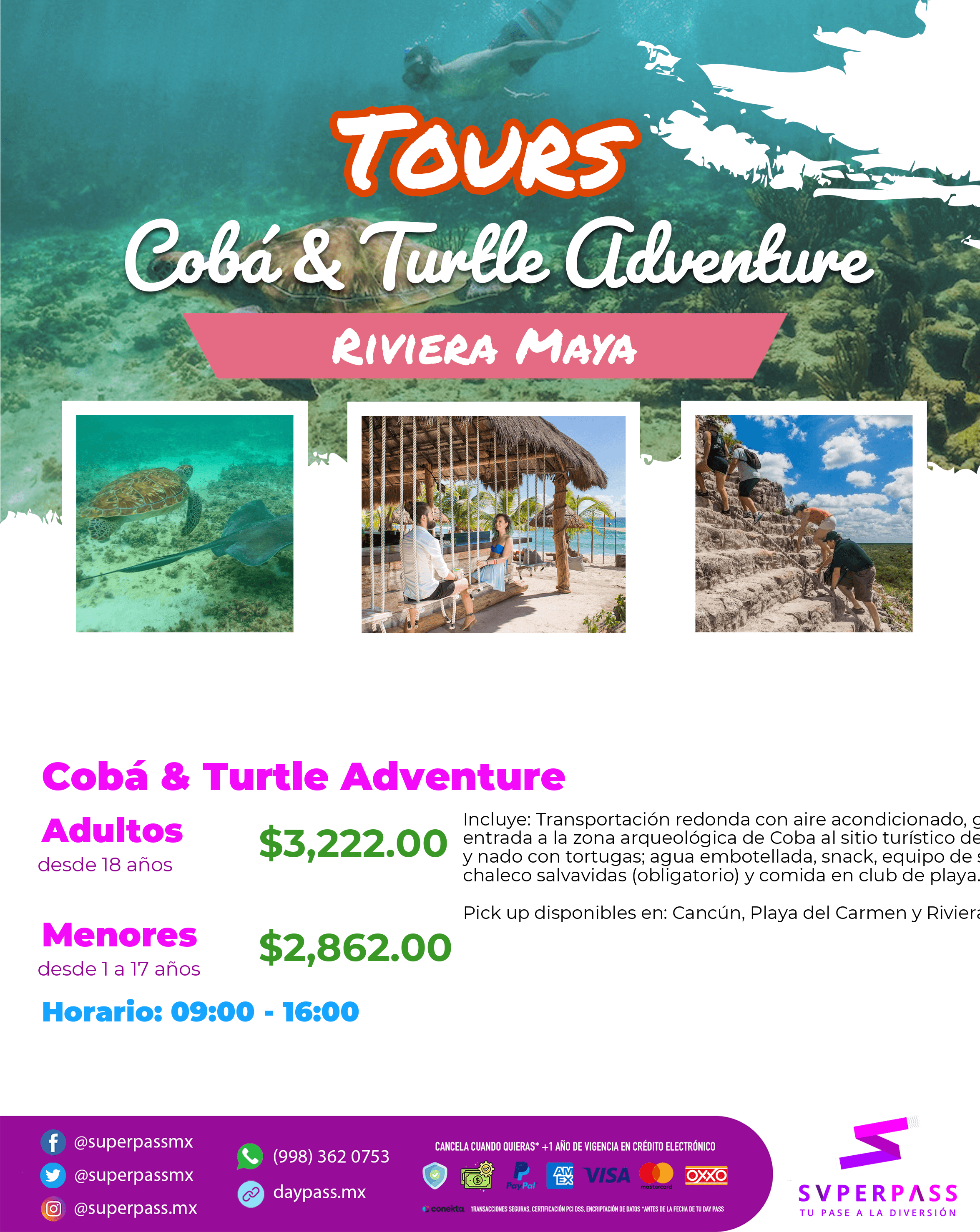 Pick up available in: Cancun, Playa del Carmen and Riviera Maya