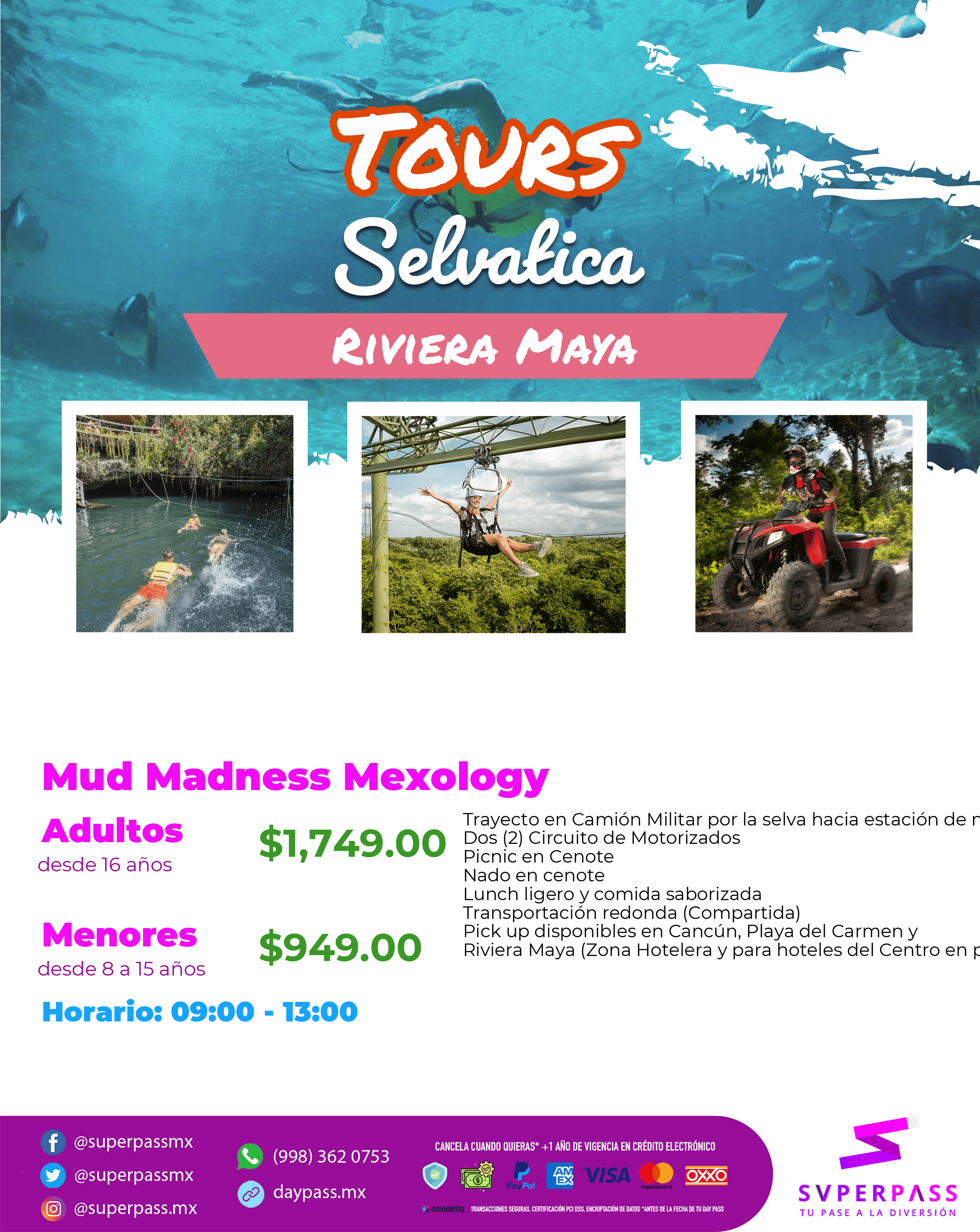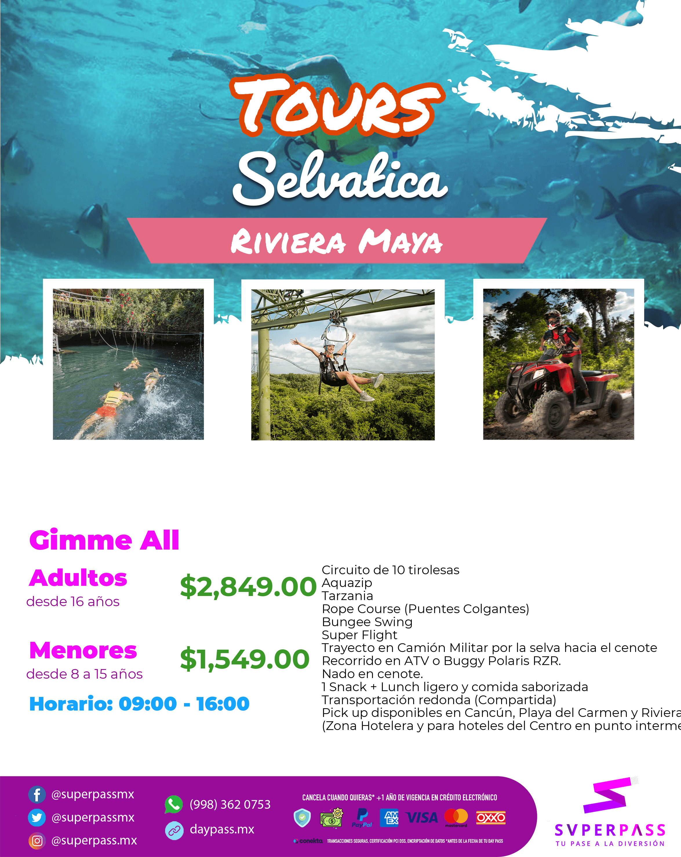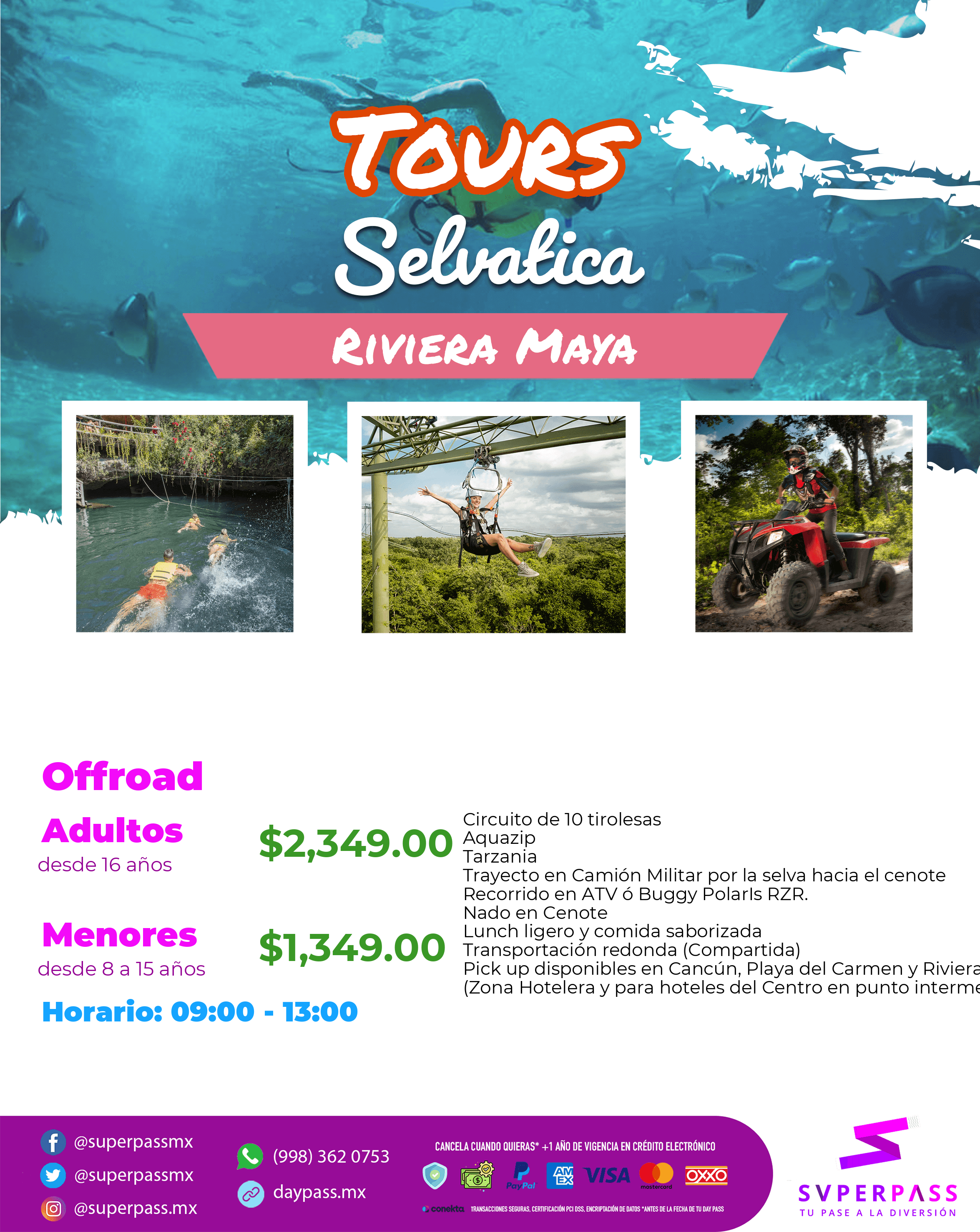 Pick up available in Cancun, Playa del Carmen and Riviera Maya (Hotel Zone and Downtown hotels in the middle)