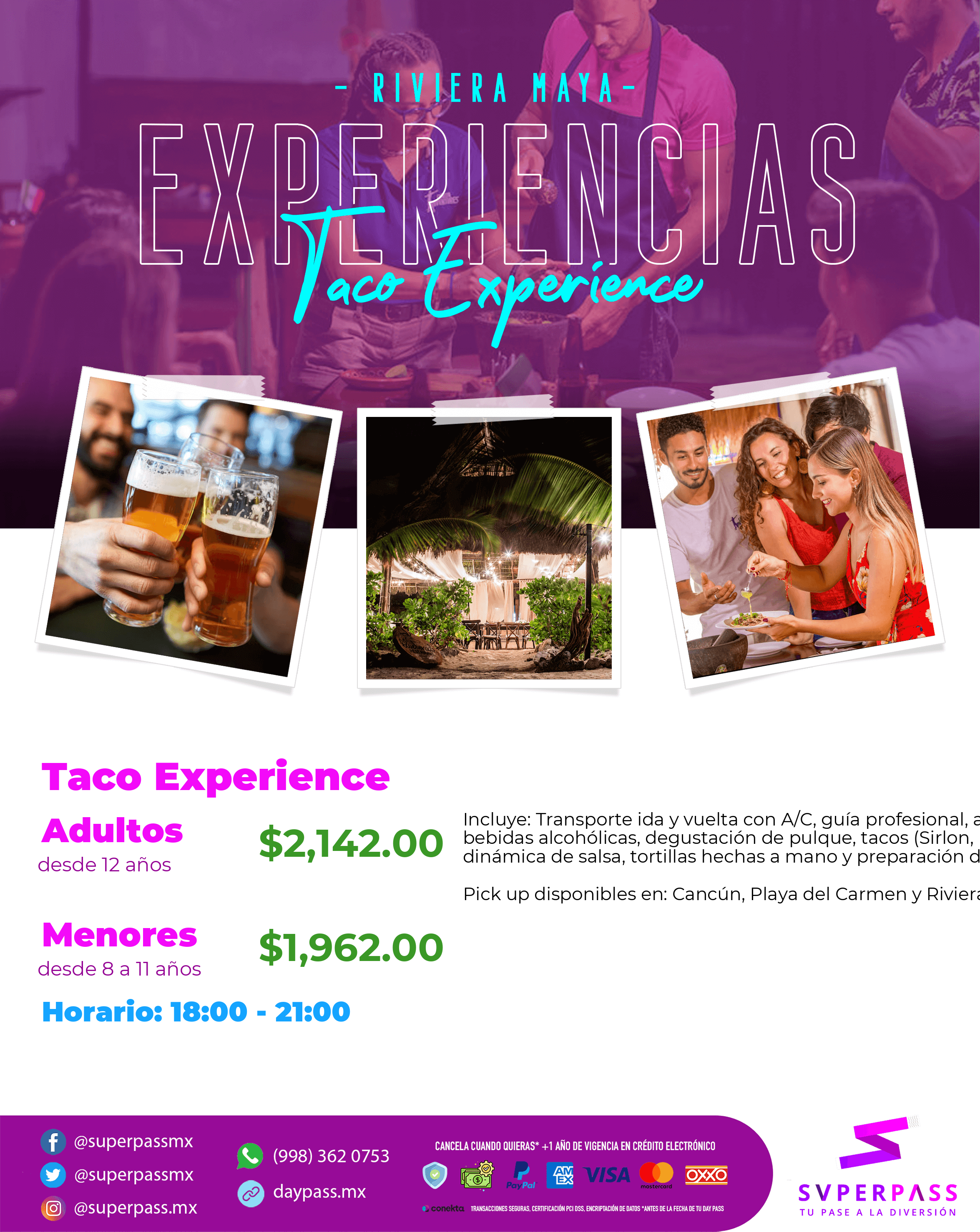 Adultos (Desde 12años )Precio : $2,142.00 MXNMenores con costo (Desde 8años / hasta 11 años )Precio : $1,962.00 MXN